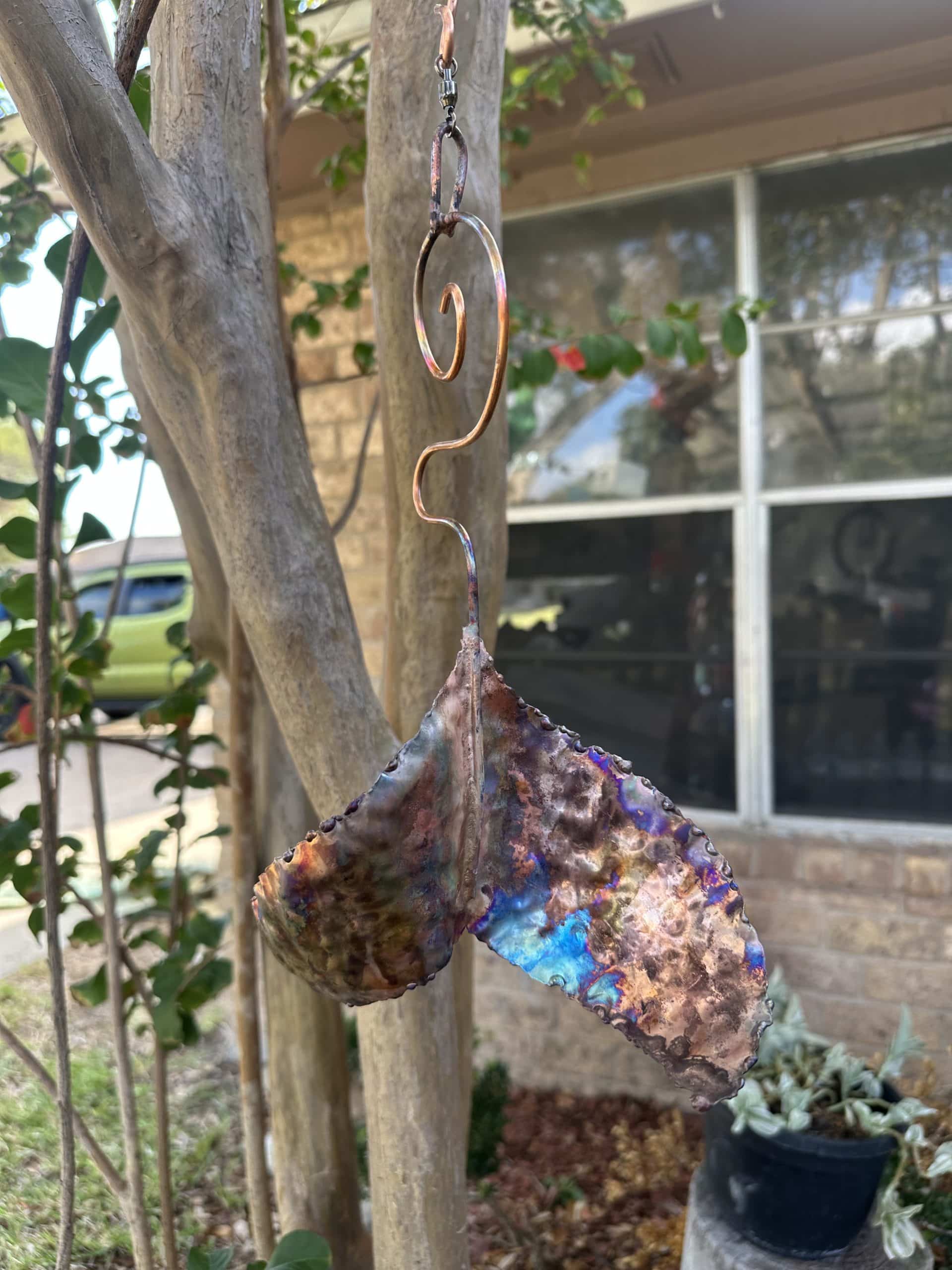 you’ll learn to cut a 12oz copper sheet and hammer into a tail, attach to a whimsically bent 8-gauge wire