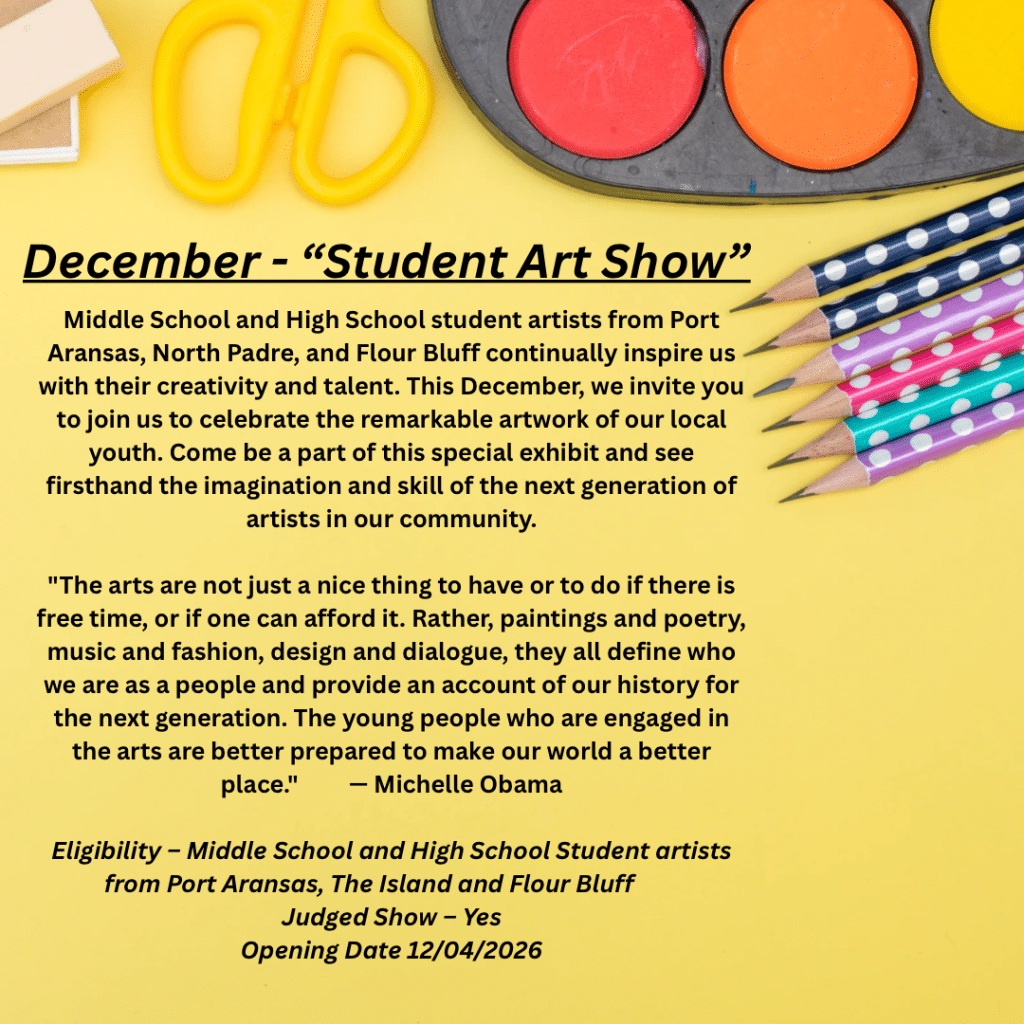 Each year, students from Flour Bluff Independent School District, Port Aransas Independent School District, and Seashore Middle Academy are invited to exhibit their art and demonstrate what they have learned from their teachers.